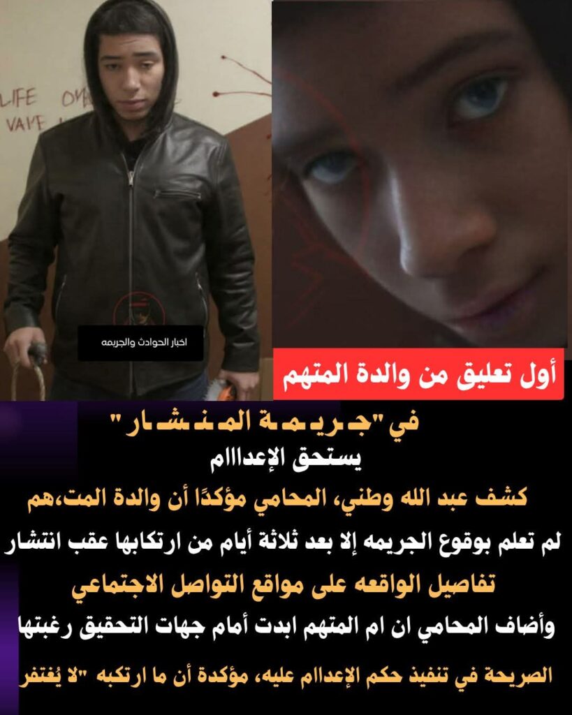 🚨🚨🚨🚨🚨🚨🚨كشف عبد الله وطني المحامي أن والدة المت،هم لم تعلم بوقوع الجر،..يمة إلا بعد مرور ثلاثة أيام على ارتكابها، وذلك بعد انتشار تفاصيل الواقعة عبر مواقع التواصل الاجتماعي، لتدخل بعدها في حالة صد، مة شديدة حين علمت أن ابنها هو الجا،ني.