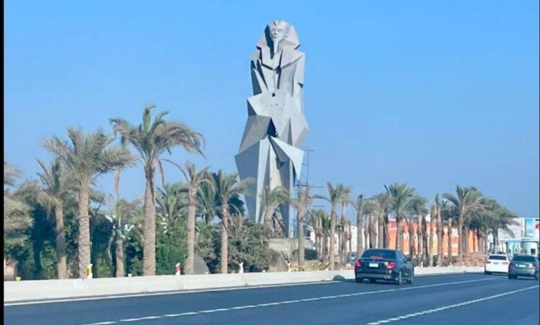 تمثال فرعوني ضخم يزين طريق مصر إسكندرية في انتظار افتتاح المتحف الكبير