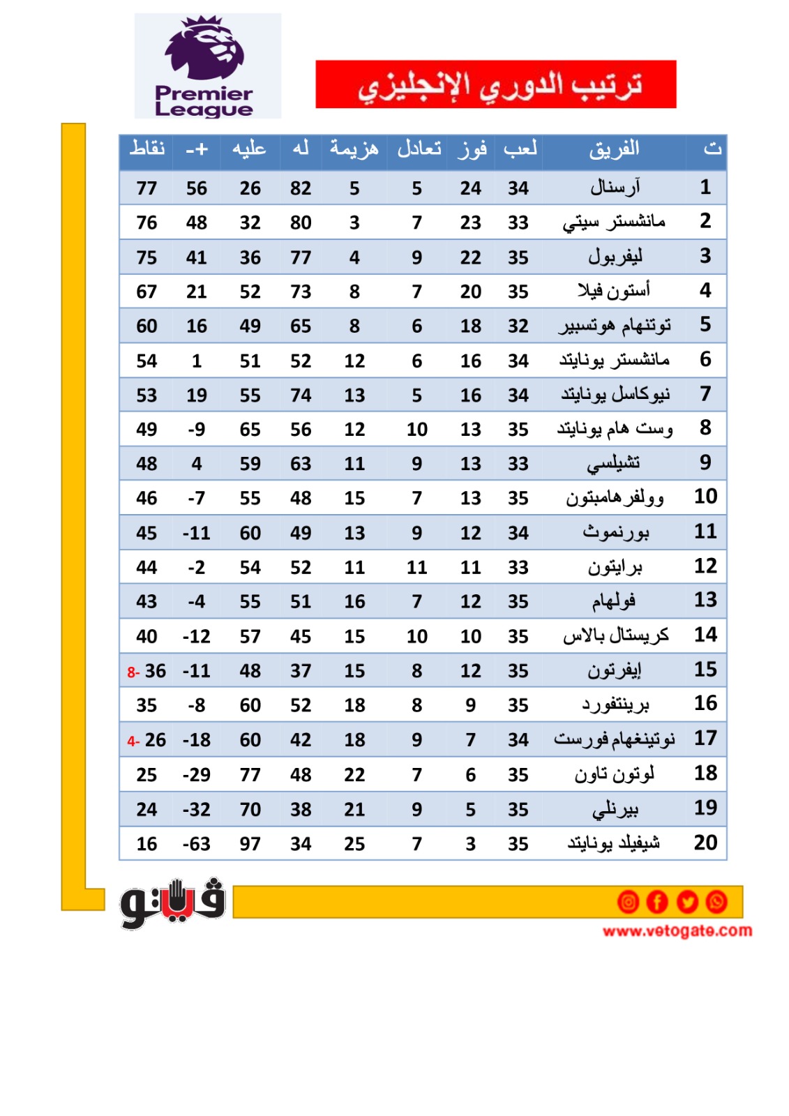 ويحتل أرسنال ترتيب الدوري الإنجليزي برصيد 77 نقطة، متقدمًا بفارق نقطة عن مانشستر سيتي الذي يتبقى له مباراة مؤجلة أمام توتنهام.